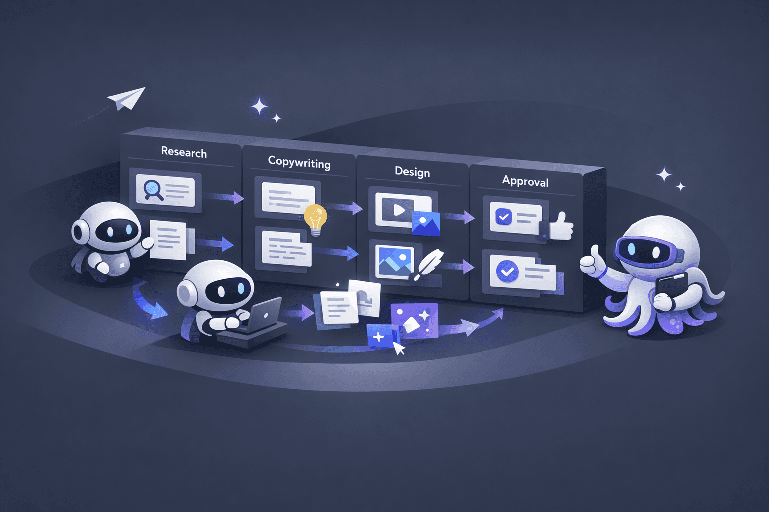 In practice, that means agents operate against a structured pipeline. One step can pull competitor signals and turn them into usable angles. Another can generate creative directions from those angles. Another can prepare variants for review. Another can package approved assets and copy for publishing. Another can push the final payload to the right channel. The magic is not in any single generation step. The magic is in continuity.