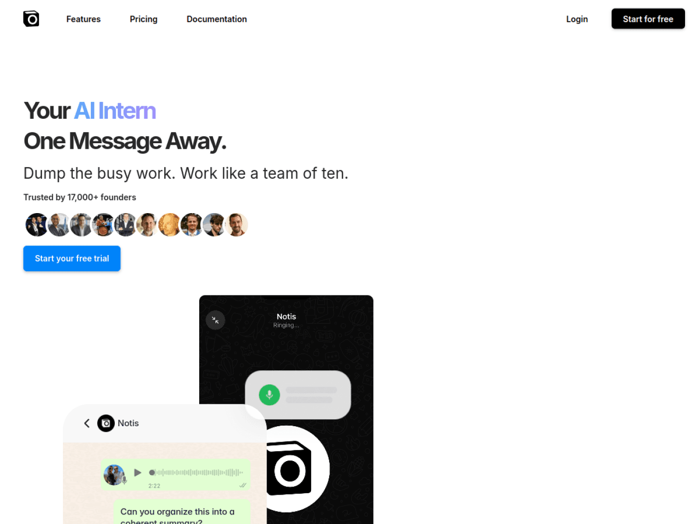 Notis homepage hero — Your AI Intern. One Message Away.