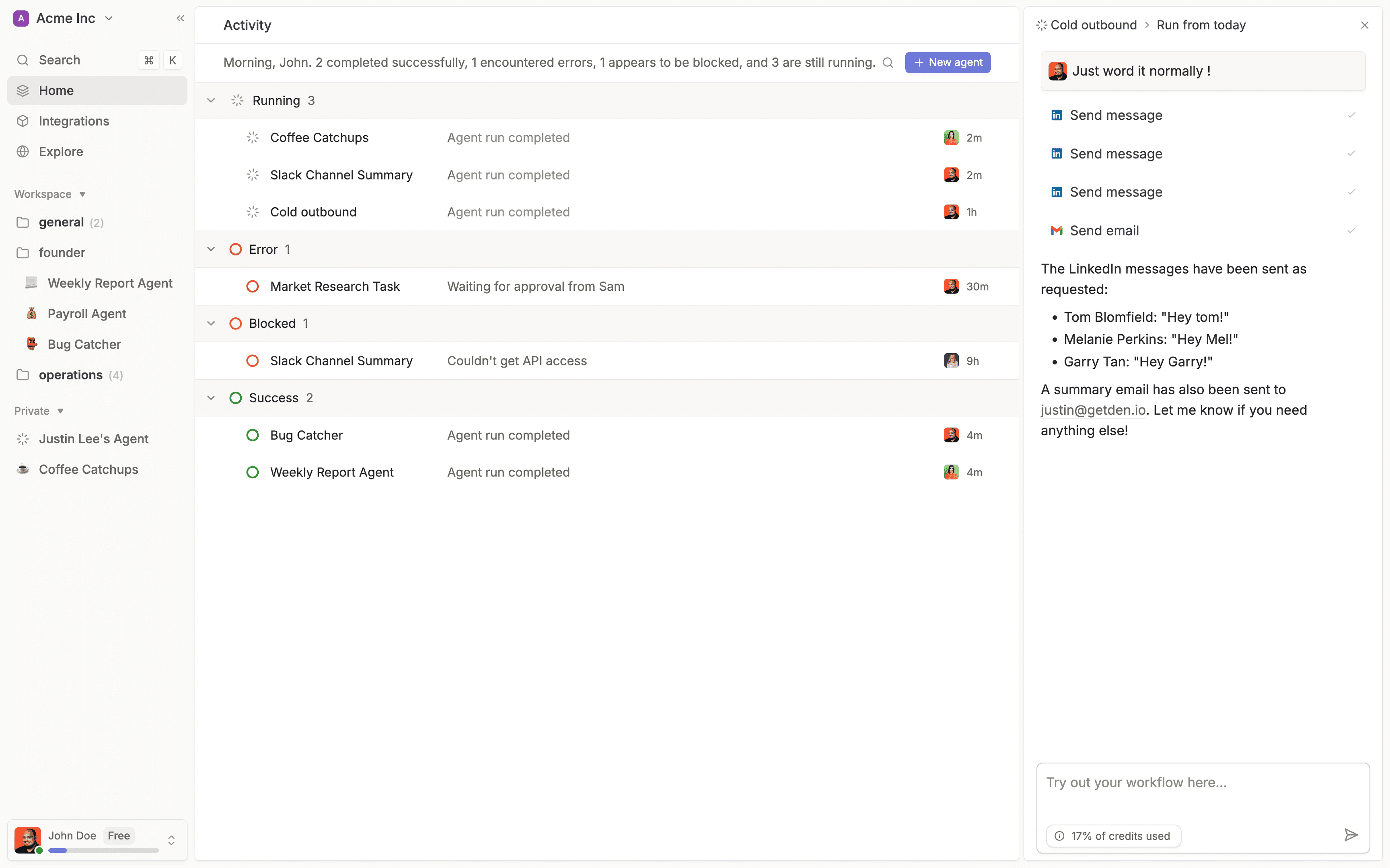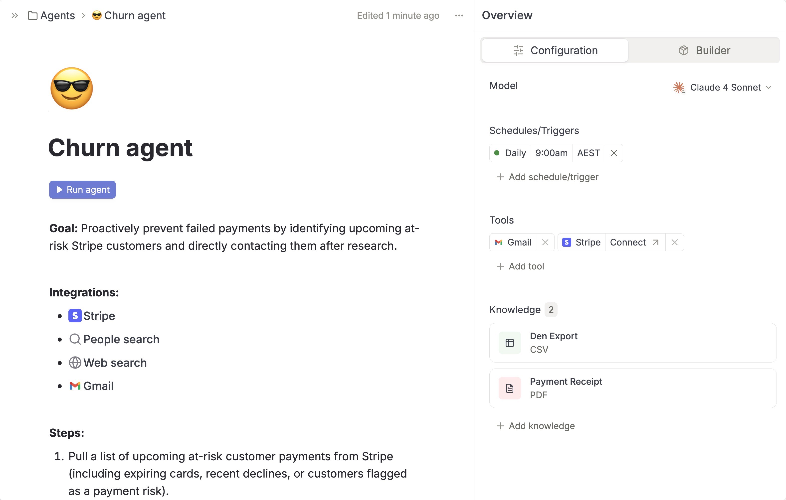 Den leans heavily into agents that can be triggered by events or schedules, with no-code setup highlighted on the homepage. This is appealing when you want reusable, persistent agents that operate as ongoing workers.