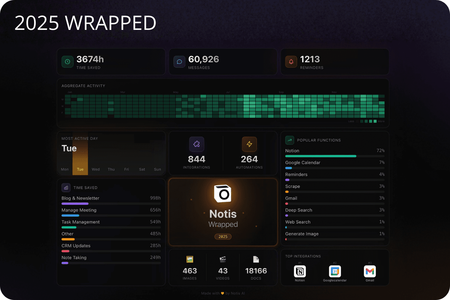 We also introduced Automations, Advanced voice modes, image/video/audio generation, long term memory and no less than 3 major iterations of the Notis agentic engine 😅. Our 2026 challenge will be to make sure all those tools find their way to your workflow.