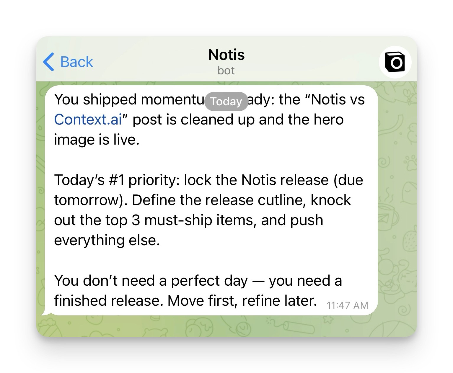 Each morning, Notis acts as your personal executive coach. It looks at: